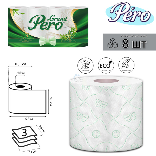 Бумага туалетная 8 рулонов 3-х слойная GrandPero Зеленый чай 1923