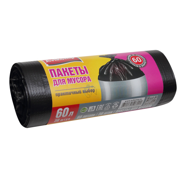 Мешки для мусора 60 л в рулоне 30 шт 58*68 см ПНД 9 мкм Avikomp Praktisch 6092 черные