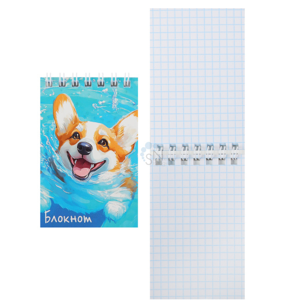 Блокнот А7 (70*100) 40л клетка дв спир обл мягк карт Феникс Корги купается выб лак блест 72783